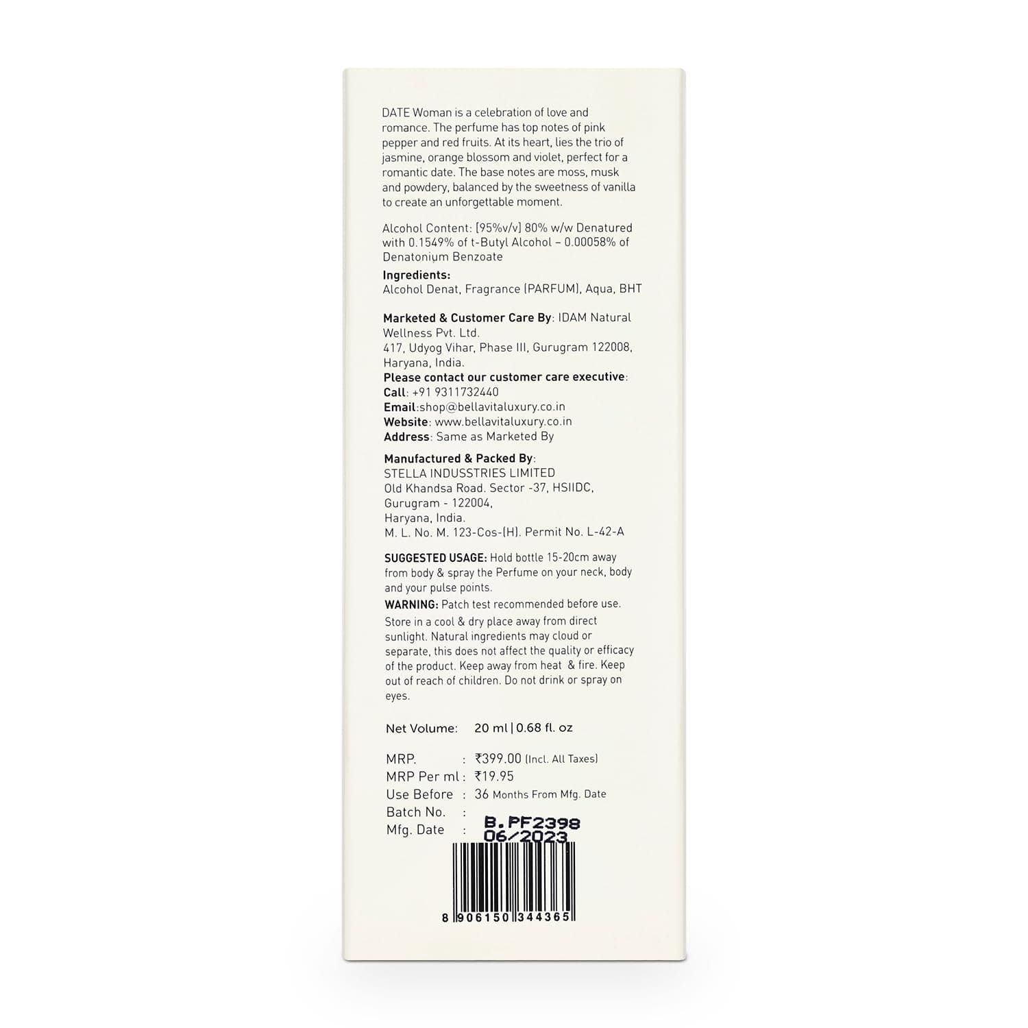 Bella Vita Luxury Date Eau De Parfum Perfume for Women with Pink Pepper, Red Fruit & Jasmine |Fruity & Spicy Long Lasting EDP Frgarance Scent, 20mlBella Vita Luxury Date Eau De Parfum Perfume for Women with Pink Pepper, Red Fruit & Jasmine |Fruity & Spicy Long Lasting EDP Frgarance Scent, 20ml
